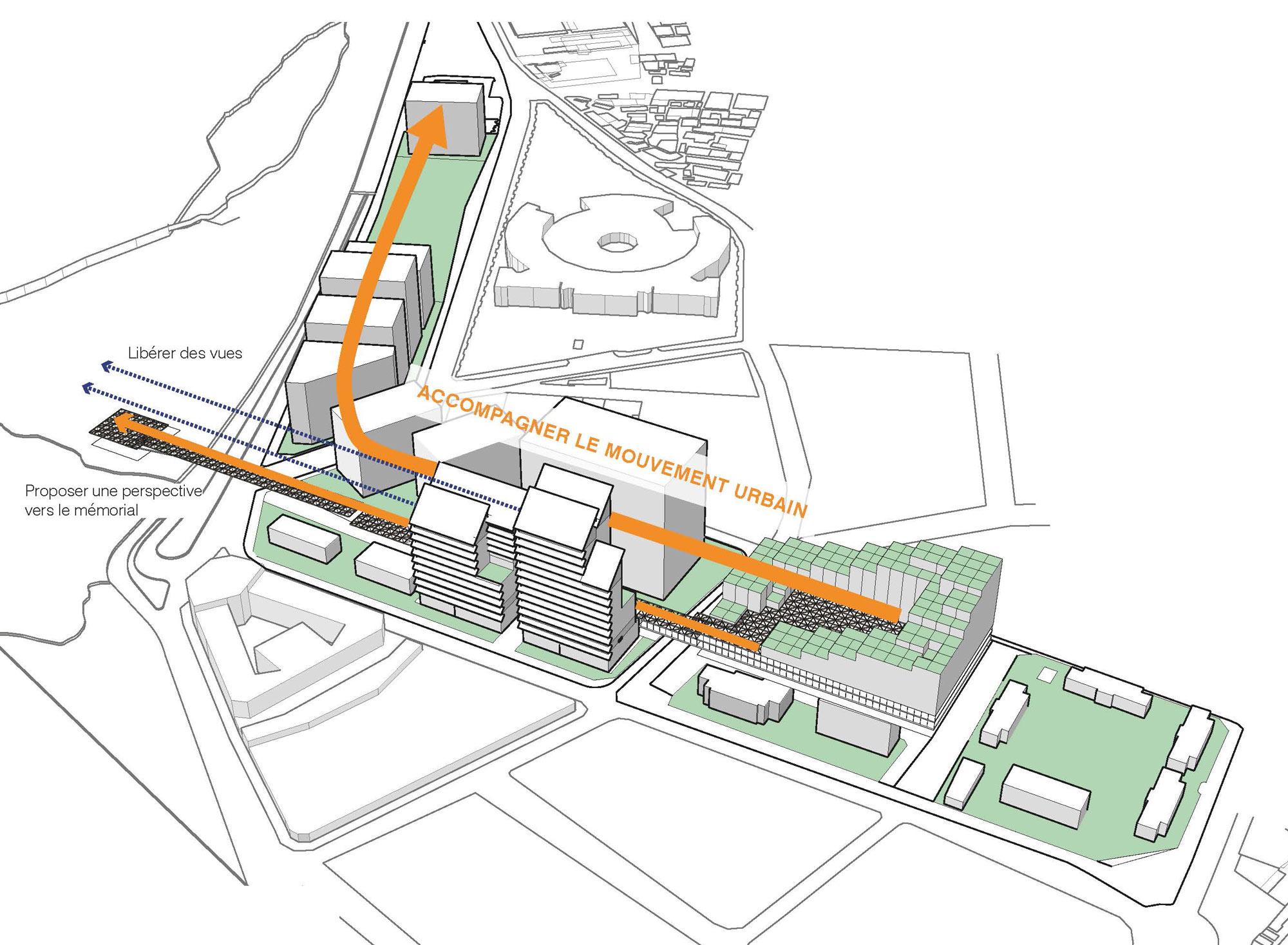 Le projet sera orienté de telle sorte à réparer la fracture urbaine et proposer une façade double créant du lien entre ces deux zones urbaines disctinctes.